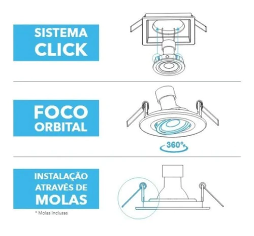 São perfeitas para embutir no seu forro e para possíveis futuras manutenções da lâmpada não será necessário remover a luminária inteira, mas sim apenas o seu encaixe central, pois utilizam o sistema Click onde é possível retirar apenas o encaixe central da lâmpada.