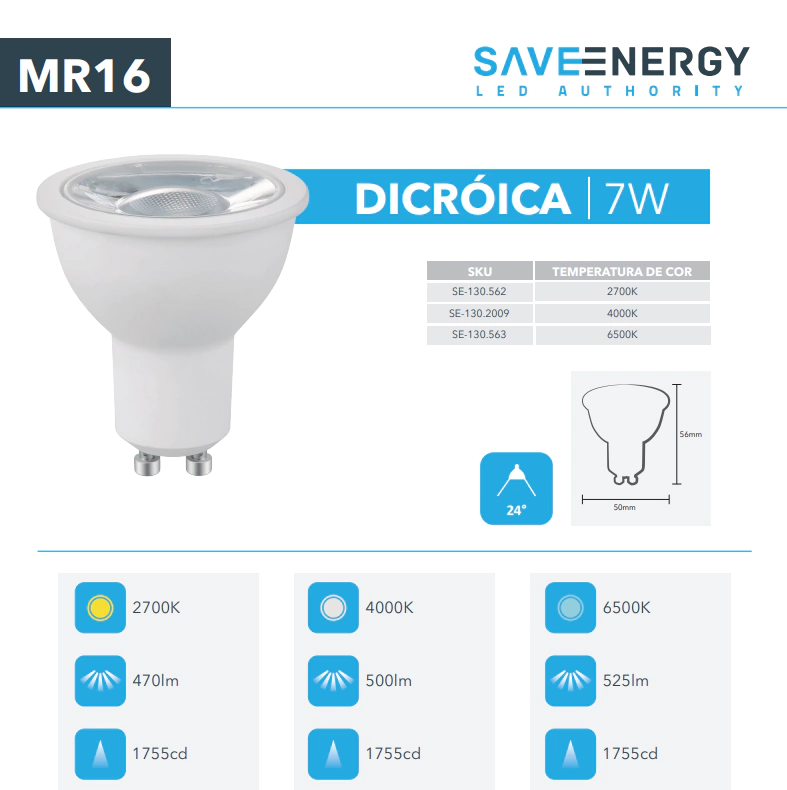 Lâmpada LED 7W MR16 Dicróica 24° GU10 - Save Energy